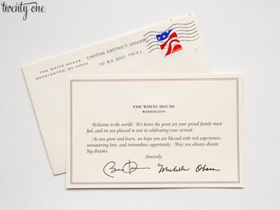 これはPresidential Greetingというサービスの一環で、赤ちゃんが誕生したときだけでなく、結婚したり結婚記念日、誕生日や命日、定年を迎えたりした節目に受け取ることができます。その他にも、ガールスカウトやボーイスカウトで何かを達成したとか、自分自身の中で大きな目標を達成したときに申し込むと、ホワイトハウスから送ってもらうことができます。